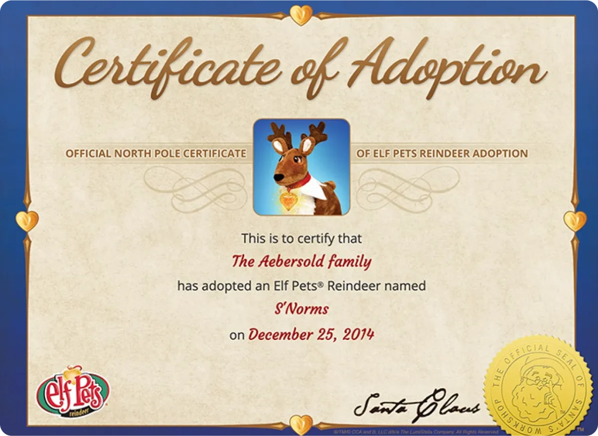Make Elf Pets® an official part of your family! Register their name to receive a personalized, printable adoption certificate from the North Pole—perfect for celebrating your holiday helper!