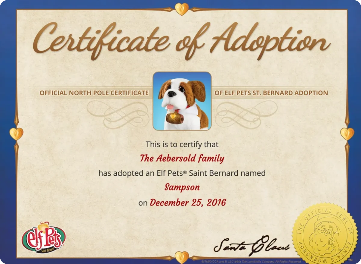 Make Elf Pets® an official part of your family! Register their name to receive a personalized, printable adoption certificate from the North Pole—perfect for celebrating your holiday helper!